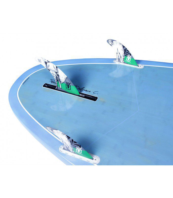 Nesta prancha, optamos por uma configuração de quilhas em thruster (3 quilhas), para uma maior variedade de opções em função do uso da prancha ou do estado do mar. É possível usar só com a quilha central para aumentar a velocidade em passeio ou com 3 quilhas para favorecer a estabilidade, aderência e controlo nas ondas.